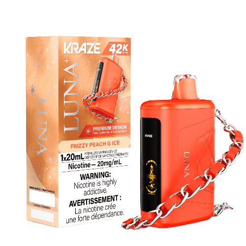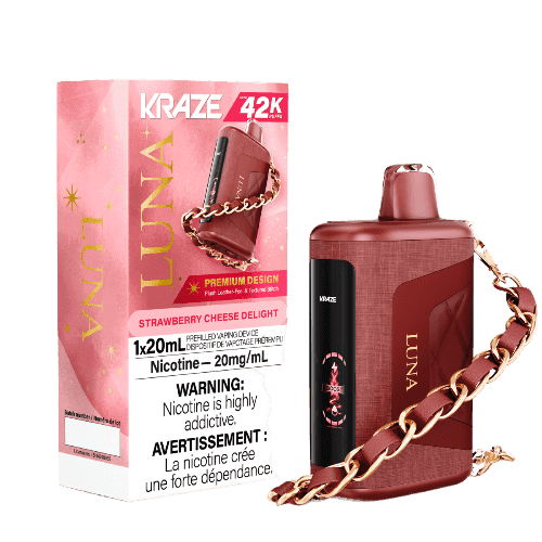 Kraze Luna 42K is a high-end vape with a stylish look and powerful features. It gives you up to 42,000 puffs, which means it lasts a long time. The outside has a soft leather feel with cool stitching, and it even comes with a bracelet you can attach for easy carrying.